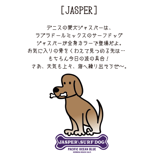 ◎デニスの愛犬ジャスパーは、ラブラドールミックスのサーフドッグ。ジャスパーが全身カラーで登場だよ。お気に入りの骨をくわえて見つめる先は… もちろん今日の波の具合!さあ、天気も上々、海へ繰り出そうぜ〜。