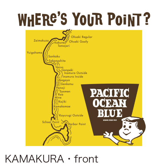 鎌倉ローカルを愛するP.O.B.の原点ともいえる、ロングセラーのデザインP.O.B.の3号目のTシャツとして誕生した “KAMAKURA” のサーフポイントが一目瞭然のマップ柄。発売当初から、「コレがあれば地図はいらない!」がキャッチフレーズ。ちょっとユニークなサーフデザインが人気のヒミツ!