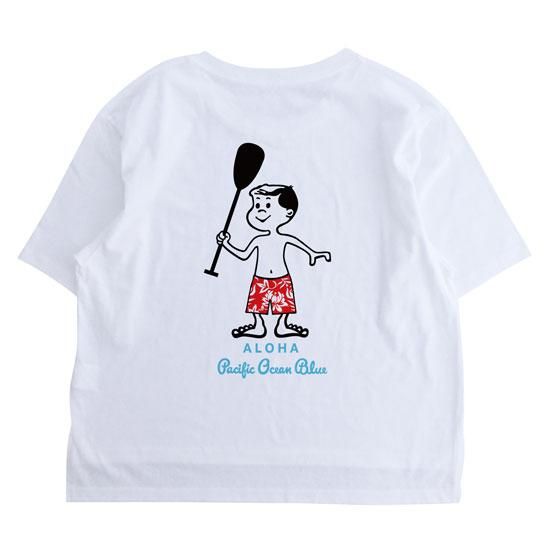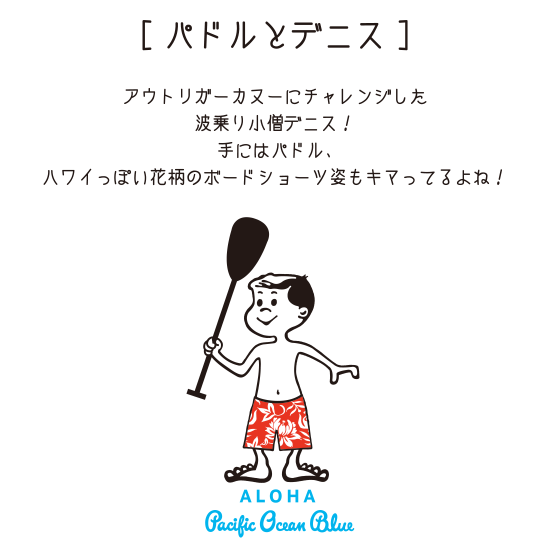 アウトリガーカヌーにチャレンジした波乗り小僧デニス!手にはパドル、ハワイっぽい花柄のボードショーツ姿もキマってるよね!
