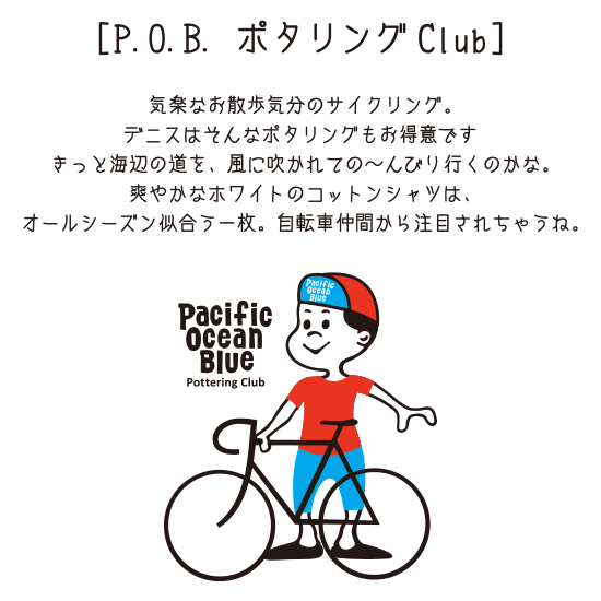 ついに、デニスが自転車生活デビュー!? いいえ、湘南じゃ昔っから自転車は、ライフスタイルの欠かせないひとつでした。ボードを運ぶ、買物に行く‥ でもね、おしゃれなデニスが乗るならやっぱりコレでしょ、このバイク!ちょっとレトロでイカしたライン、帽子だってこうじゃなきゃ!というようなこだわりがモリモリのポタリング デニスです。きっと海辺の道を、風に吹かれての〜んびり行くのかな。爽やかなホワイトのコットンシャツは、オールシーズン似合う一枚。自転車仲間から注目されちゃうね。