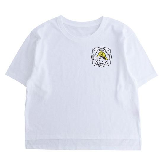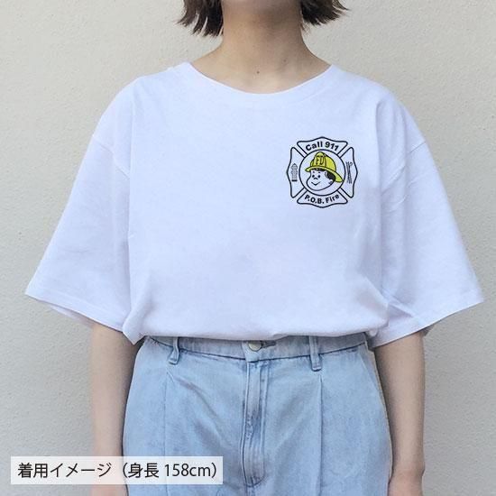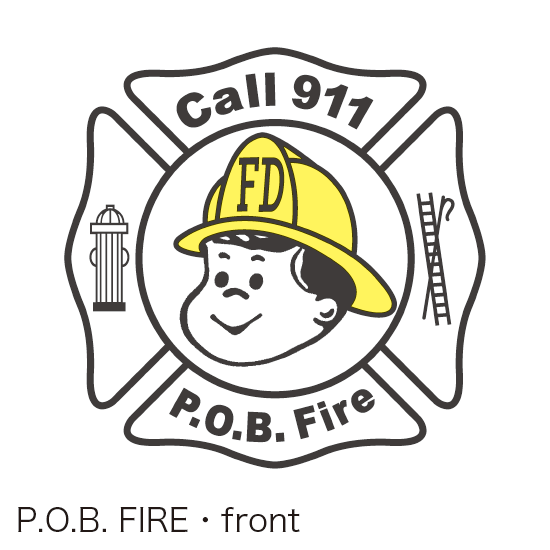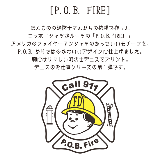 ほんものの消防士さんからの依頼で作ったコラボTシャツがルーツの「P.O.B.FIRE」!アメリカのファイヤーマンシャツのかっこいいモチーフを、P.O.B.ならではのかわいいデザインに仕上げました。胸にはりりしい消防士デニスをプリント。デニスのお仕事シリーズの第1弾です。