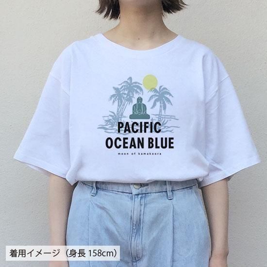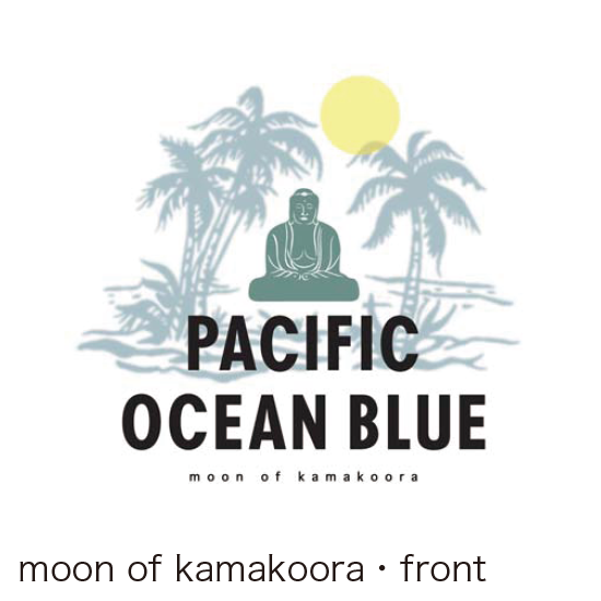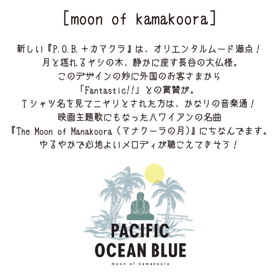 新しい『P.O.B.+カマクラ』は、オリエンタルムード満点!月と揺れるヤシの木、静かに座す長谷の大仏様。このデザインの妙に外国のお客さまから「Fantastic!!」との賞賛が。 Tシャツ名を見てニヤリとされた方は、かなりの音楽通!映画主題歌にもなったハワイアンの名曲『The Moon of Manakoora(マナクーラの月)』にちなんでます。ゆるやかで心地よいメロディが聴こえてきそう!