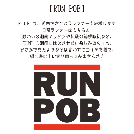 P.O.B.は、湘南でガンバるランナーを応援します日常ランナーはもちろん、賑わいの湘南マラソンや伝統の箱根駅伝など、“RUN” も湘南には欠かせない楽しみ方の1つ。どこかで見たようなとは言わずにコイツを着て、街に海に山に走り回ってみませんか!